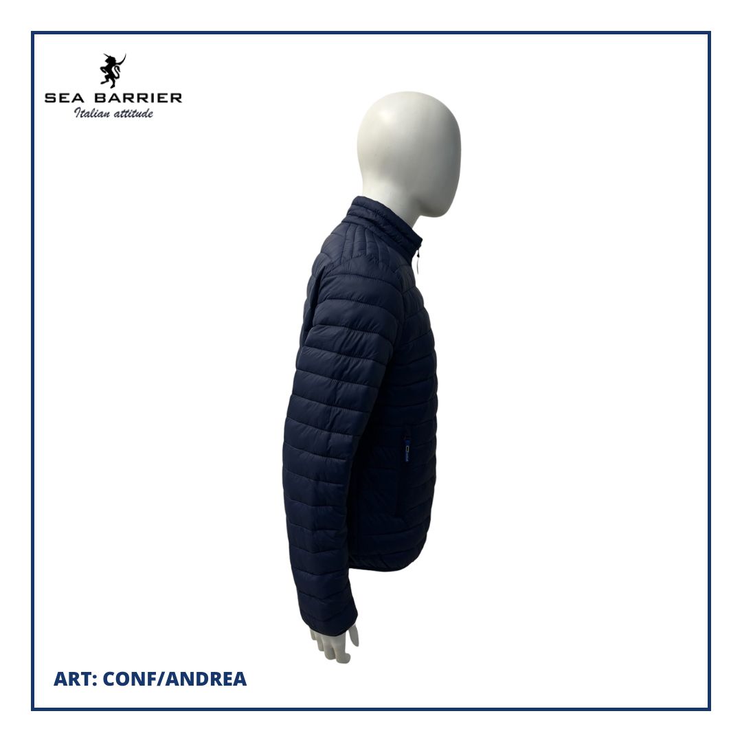 Collo in piedi, tasche vita con zip rovesciate, fondo e polsi con fettuccia elastica tono su tono. Logo su manica sinistra.