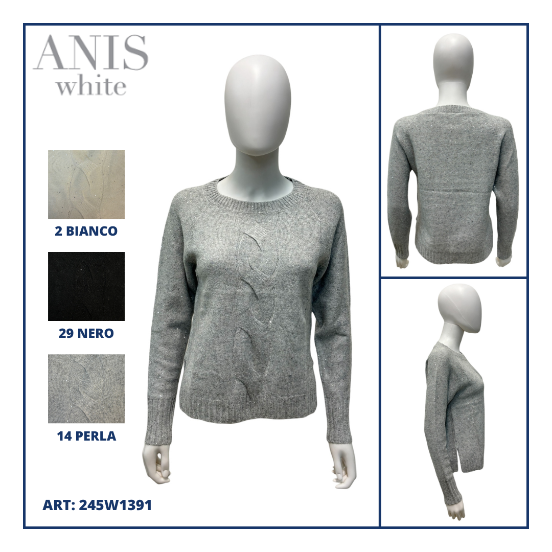 Maglia girocollo manica lunga in misto lana, treccia centrale, paillettes e spacchi laterali.